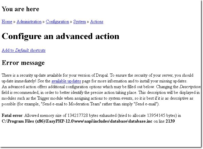 The code snippet below is from my local php.ini. You could see it only has 128M as the memory. I increase it to 1024M. The error goes away and the drupal site is running a lot faster.